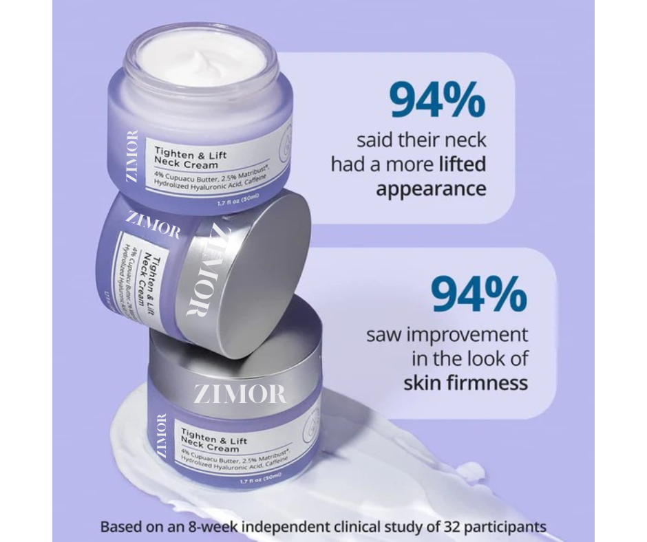 After using your serums, apply an even amount of the Tighten & Lift Neck Cream to the neck and chest, massaging in upward motions.